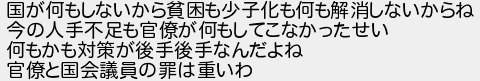 国が何もしないから貧困も少子化も何も解消しないからね 今の人手不足も官僚が何もしてこなかったせい 何もかも対策が後手後手なんだよね 官僚と国会議員の罪は重いわ