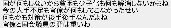 国が何もしないから貧困も少子化も何も解消しないからね 今の人手不足も官僚が何もしてこなかったせい 何もかも対策が後手後手なんだよね 官僚と国会議員の罪は重いわ