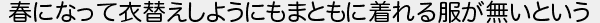 441: (ワッチョイ 1657-2RjV) [sage] 2026/04/11(土) 12:18:19.59 ID:zuOwCYLK0 春になって衣替えしようにもまともに着れる服が無いという http://mevius.5ch.io/test/read.cgi/utu/1771663646/441