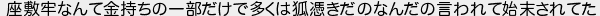 467: (ワッチョイ ff6a-9YKN) [sage] 2026/04/12(日) 14:42:01.05 ID:oBPcyWdS0 座敷牢なんて金持ちの一部だけで多くは狐憑きだのなんだの言われて始末されてた http://mevius.5ch.io/test/read.cgi/utu/1771663646/467