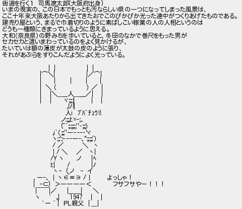 208: (ジパング) [] 2026/02/20(金) 07:29:43.58 ID:qN5RHYaa 街道を行く1 司馬遼太郎(大阪府出身) いまの現実の、この日本でもっとも汚ならしい県の一つになってしまった風景は、 ここ十年来大阪あたりから出てきたおでこのぴかぴか光った連中がつくりあげたものである。 建売り屋という、まるで巾着切りのように素ばしこい稼業の人の人相というのは どうも一種類にきまっているように思える。 大和(奈良県)の野みちを歩いていると、冬田のなかで巻尺をもった男が セカセカと這いまわっているのをよく見かけるが、 たいていは額の薄皮が太鼓の皮のように張り、 それがあぶらをすりこんだようによく光っている。 | | | | |⌒\| |/⌒| | | | | | | \ ( ) / | | |\___人____/| | | | ヾ;;;;| | | ,lノl| 人i ブバチュウ!! ノ:;;,ヒ=-;、 (~´;;;;;;;゙'‐;;;) ,i`(;;;゙'―---‐'ヾ ヽ;;';ー--―-、'';;;;;゙) / / \ 丶 |/ \ / 丶| /Y ヽ ノ |ヘ ヒ| / |ノ 丶- (_ノ - イ , ―-、 |丶∈≡∋ /| よっしゃ! | -⊂) >――――< フサフサやー!!! | ̄ ̄|/ |__| \ ヽ ` ,.| 1947 | | `- ´ | PL親父 | _| http://egg.5ch.net/test/read.cgi/develop/1769856442/208