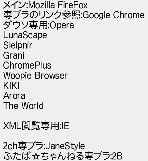 167: [sage] 2010/11/28(日) 03:12:30 ID:??? メイン:Mozilla FireFox 専ブラのリンク参照:Google Chrome ダウソ専用:Opera LunaScape Sleipnir Grani ChromePlus Woopie Browser KIKI Arora The World XML閲覧専用:IE 2ch専ブラ:JaneStyle ふたば☆ちゃんねる専ブラ:2B http://mevius.5ch.net/test/read.cgi/hack/1027669232/167