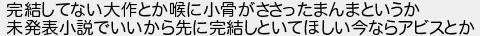 完結してない大作とか喉に小骨がささったまんまというか 未発表小説でいいから先に完結しといてほしい今ならアビスとか