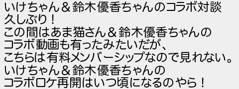 いけちゃん鈴木優香ちゃんのコラボ対談 久しぶり! この間はあま猫さん鈴木優香ちゃんの コラボ動画も有ったみたいだが こちらは有料メンバーシップなので見れない いけちゃん鈴木優香ちゃんの コラボロケ再開はいつ頃になるのやら!