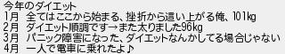 今年のダイエット 月 全てはここから始まる挫折から這い上がる俺 月 ダイエット順調ですまた太りました 月 パニック障害になったダイエットなんかしてる場合じゃない 月 一人で電車に乗れたよ