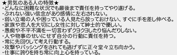 男気のある人の特徴 どんなに困難な状況でも最後まで責任を持ってやり遂げる ぶれない強い信念があり感情に左右されない 弱い立場の人や困っている人見たら放っておけないすぐに手を差し伸べる 家族や恋人を大切にし女性に対して紳士的で優しい 愚痴や不平不満を一切言わずクヨクヨしたり悩んだりしない 人や物事のせいにせず自分の行動に責任を持つ 常に先回りして考え行動する 攻撃やバッシングをされても逃げずに正堂立ち向かう 仕事に誇りを持ち常に向上心を持っている