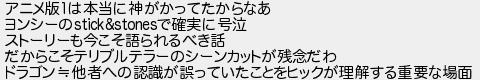 アニメ版は本当に神がかってたからなあ ヨンシーので確実に号泣 ストーリーも今こそ語られるべき話 だからこそテリブルテラーのシーンカットが残念だわ ドラゴン他者への認識が誤っていたことをヒックが理解する重要な場面