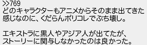 どのキャラクターもアニメからそのまま出てきた 感じなのにくだらんポリコレでぶち壊し エキストラに黒人やアジア人が出てたが ストーリーに関与しなかったのは良かった