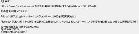 905: [] 2025/10/23(木) 21:18:45.85 ID:Looq1ry6 2月東京 https://x.com/cineoke/status/1981194540620132789?t=lQFACnBAK6brIwrzh0QrqQ&s=19 あの感動が帰ってきます! 『#ヒックとドラゴン』シネマオーケストラコンサート、2026年2月再演決定! 「ヒックとドラゴン」第 1 作(2010 年公開)の全編を大スクリーンで上映しフルオーケストラが音楽を映画に合わせて生演奏🎻 先行販売は本日18時から🎟 詳細は🔻 cineoke.info/on/dragon/ http://lavender.5ch.net/test/read.cgi/cinema/1753640407/905
