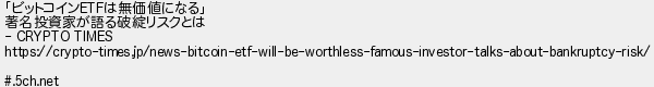 5: (ワッチョイ 97e8-SnCO) [] 2025/07/28(月) 01:41:16.37 ID:GELBNYvj0 「ビットコインETFは無価値になる」 著名投資家が語る破綻リスクとは - CRYPTO TIMES https://crypto-times.jp/news-bitcoin-etf-will-be-worthless-famous-investor-talks-about-bankruptcy-risk/ #.5ch.net http://fate.5ch.net/test/read.cgi/cryptocoin/1753633833/5