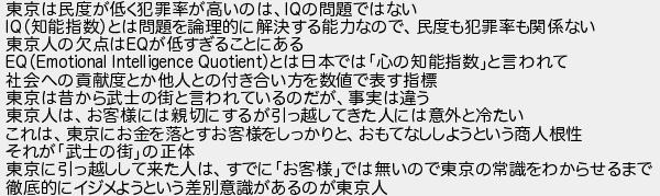 東京は民度が低く犯罪率が高いのはの問題ではない 知能指数とは問題を論理的に解決する能力なので民度も犯罪率も関係ない 東京人の欠点はが低すぎることにある とは日本では心の知能指数と言われて 社会への貢献度とか他人との付き合い方を数値で表す指標 東京は昔から武士の街と言われているのだが事実は違う 東京人はお客様には親切にするが引っ越してきた人には意外と冷たい これは東京にお金を落とすお客様をしっかりとおもてなししようという商人根性 それが武士の街の正体 東京に引っ越しして来た人はすでにお客様では無いので東京の常識をわからせるまで 徹底的にイジメようという差別意識があるのが東京人