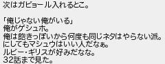 次はガビョール入れるとこ 俺じゃない俺がいる 俺がゲシュホ 俺は飽きっぽいから何度も同じネタはやらない派 にしてもマシュウはいい人だなぁ ルビーギリスが好みだなな 32話まで見た