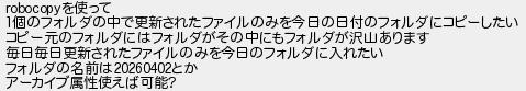 943: [] 2026/04/01(水) 18:44:54.39 ID:vmpY0cde robocopyを使って 1個のフォルダの中で更新されたファイルのみを今日の日付のフォルダにコピーしたい コピー元のフォルダにはフォルダがその中にもフォルダが沢山あります 毎日毎日更新されたファイルのみを今日のフォルダに入れたい フォルダの名前は20260402とか アーカイブ属性使えば可能? http://mevius.5ch.io/test/read.cgi/tech/1663153441/943