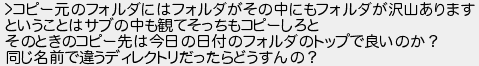 コピー元のフォルダにはフォルダがその中にもフォルダが沢山あります ということはサブの中も観てそっちもコピーしろと そのときのコピー先は今日の日付のフォルダのトップで良いのか? 同じ名前で違うディレクトリだったらどうすんの?