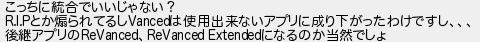 11: [sage] 2023/05/15(月) 14:37:03.72 ID:EkNpOgNu こっちに統合でいいじゃない? R.I.Pとか煽られてるしVancedは使用出来ないアプリに成り下がったわけですし、、、 後継アプリのReVanced、ReVanced Extendedになるのか当然でしょ http://egg.5ch.net/test/read.cgi/android/1684122607/11