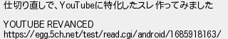 585: [sage] 2023/06/05(月) 07:38:23.78 ID:hhGk/oxa 仕切り直しで、YouTubeに特化したスレ作ってみました YOUTUBE REVANCED https://egg.5ch.net/test/read.cgi/android/1685918163/ http://egg.5ch.net/test/read.cgi/android/1684122607/585