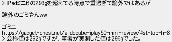 421: (ワッチョイ 539b-HaiO) [sage] 2023/10/15(日) 09:49:35.10 ID:GMQ1KgNJ0 > iPadミニ6の293gを超えてる時点で重過ぎて論外ではあるが 論外のゴミやんww ゴミニ https://gadget-chest.net/alldocube-iplay50-mini-review/#st-toc-h-8 > 公称値は292gですが、筆者が実測した値は296gでした。 http://egg.5ch.net/test/read.cgi/android/1696564366/421
