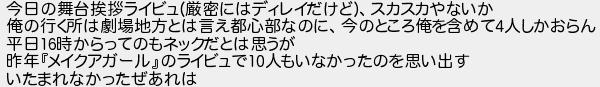 今日の舞台挨拶ライビュ厳密にはディレイだけどスカスカやないか 俺の行く所は劇場地方とは言え都心部なのに今のところ俺を含めて人しかおらん 平日時からってのもネックだとは思うが 昨年メイクアガールのライビュで人もいなかったのを思い出す いたまれなかったぜあれは
