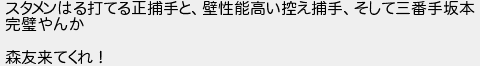 スタメンはる打てる正捕手と壁性能高い控え捕手そして三番手坂本 完やんか 森友来てくれ!