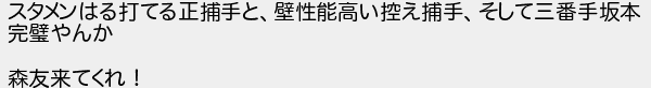 スタメンはる打てる正捕手と壁性能高い控え捕手そして三番手坂本 完やんか 森友来てくれ!