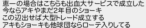 恵一の場合はこちらも出血大サービスで成立した 今ならアキやまだ2年目のショーキ この辺出せば大型トレード成立する アキもショーキも他球団ならローテ入りしてる