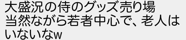 80: (スップ Sdc2-pm+Q [1.72.2.202 [上級国民]]) [] 2023/03/07(火) 08:55:57.45 ID:4yW94KqMd 大盛況の侍のグッズ売り場 当然ながら若者中心で、老人は いないなw http://rio2016.5ch.net/test/read.cgi/base/1678108708/80