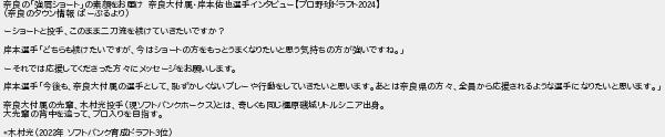 39: 警備員[Lv.4][新芽] (ワッチョイ) [sage] 2024/10/20(日) 09:08:53.34 ID:yYQJevuw0 奈良の「強肩ショート」の素顔をお届け 奈良大付属・岸本佑也選手インタビュー【プロ野球ドラフト2024】 (奈良のタウン情報 ぱーぷるより) ーショートと投手、このまま二刀流を続けていきたいですか? 岸本選手「どちらも続けたいですが、今はショートの方をもっとうまくなりたいと思う気持ちの方が強いですね。」 ーそれでは応援してくださった方々にメッセージをお願いします。 岸本選手「今後も、奈良大付属の選手として、恥ずかしくないプレーや行動をしていきたいと思います。あとは奈良県の方々、全員から応援されるような選手になりたいと思います。」 奈良大付属の先輩、木村光投手(現ソフトバンクホークス)とは、奇しくも同じ橿原磯城リトルシニア出身。 大先輩の背中を追って、プロ入りを目指す。 *木村光(2022年 ソフトバンク育成ドラフト3位) http://rio2016.5ch.net/test/read.cgi/base/1729301708/39