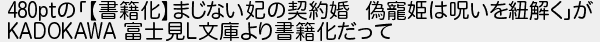 653: [] 2026/04/10(金) 10:37:23.92 ID:0QgesC3x 480ptの「【書籍化】まじない妃の契約婚 偽寵姫は呪いを紐解く」が KADOKAWA 富士見L文庫より書籍化だって http://mevius.5ch.io/test/read.cgi/bookall/1753669848/653