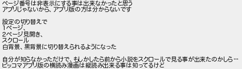 ページ番号は非表示にする事は出来なかったと思う アプリじゃないからアプリ版の方は分からないです 設定の切り替えで 1ページ 2ページ見開き スクロール 白背景黒背景に切り替えられるようになった 自分が知らなかっただけでもしかしたら前から小説をスクロールで見る事が出来たのかしら ピッコマアプリ版の横読み漫画は縦読み出来る事は知ってるけど