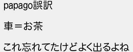 21: [sage] 2022/08/04(木) 23:52:21.27 ID:Vcivgsfd0 papago誤訳 車=お茶 これ忘れてたけどよく出るよね http://fate.5ch.net/test/read.cgi/comic/1659617607/21