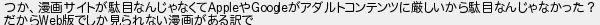 つか漫画サイトが駄目なんじゃなくてやがアダルトコンテンツに厳しいから駄目なんじゃなかった? だから版でしか見られない漫画がある訳で