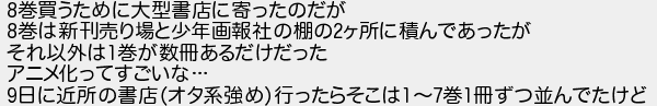 巻買うために大型書店に寄ったのだが 巻は新刊売り場と少年画報社の棚のヶ所に積んであったが それ以外は巻が数冊あるだけだった アニメ化ってすごいな 日に近所の書店オタ系強め行ったらそこは巻冊ずつ並んでたけど