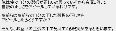 俺は俺で自分の選択が正しいと思っているから音源して 自説の正しさをアピールしているわけです お前らはお前らで自分の下した選択の正しさを アピールしたらどうですか? そんなお互いの主張の中で見えてくる現実があると思います