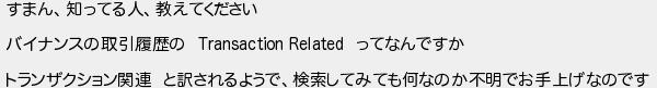 すまん知ってる人教えてください バイナンスの取引履歴の ってなんですか トランザクション関連 と訳されるようで検索してみても何なのか不明でお手上げなのです