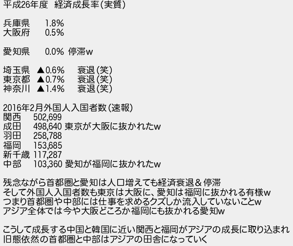 653: (空) [] 2017/06/04(日) 08:41:56.55 ID:W1sQ3W+u 平成26年度 経済成長率(実質) 兵庫県 1.8% 大阪府 0.5% 愛知県 0.0% 停滞w 埼玉県 ▲0.6% 衰退(笑) 東京都 ▲0.7% 衰退(笑) 神奈川 ▲1.4% 衰退(笑) 2016年2月外国人入国者数(速報) 関西 502,699 成田 498,640 東京が大阪に抜かれたw 羽田 258,788 福岡 153,685 新千歳 117,287 中部 103,360 愛知が福岡に抜かれたw 残念ながら首都圏と愛知は人口増えても経済衰退&停滞 そして外国人入国者数も東京は大阪に、愛知は福岡に抜かれる有様w つまり首都圏や中部には仕事を求めるクズしか流入していないことw アジア全体では今や大阪どころか福岡にも抜かれる愛知w こうして成長する中国と韓国に近い関西と福岡がアジアの成長に取り込まれ 旧態依然の首都圏と中部はアジアの田舎になっていく http://egg.5ch.io/test/read.cgi/develop/1328929542/653