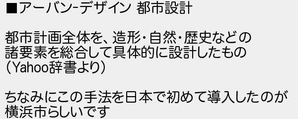 アーバンデザイン 都市設計 都市計画全体を造形自然歴史などの 諸要素を総合して具体的に設計したもの 辞書より ちなみにこの手法を日本で初めて導入したのが 横浜市らしいです