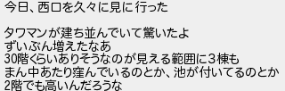 今日西口を久に見に行った タワマンが建ち並んでいて驚いたよ ずいぶん増えたなあ 階くらいありそうなのが見える範囲に3棟も まん中あたり窪んでいるのとか池が付いてるのとか 階でも高いんだろうな