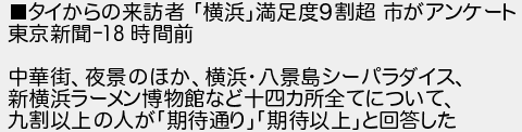623: (神奈川県) [sage] 2017/01/15(日) 01:37:39 ID:iOrNnXu0 ■タイからの来訪者 「横浜」満足度9割超 市がアンケート 東京新聞-18 時間前 中華街、夜景のほか、横浜・八景島シーパラダイス、 新横浜ラーメン博物館など十四カ所全てについて、 九割以上の人が「期待通り」「期待以上」と回答した http://egg.5ch.net/test/read.cgi/develop/1424709385/623