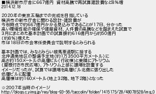 7: [sage] 2015/02/25(水) 00:07:37 ID:E6/A9eTW ■横浜新市庁舎に667億円 資材高騰で再試算建設費など8%増 2014.12.18 2020年の東京五輪までの完成を目指している 横浜市の新市庁舎に関わる設計・建設費が 今秋時点で約667億円かかる見込みであることが17日、分かった 高い環境性能の確保や建築資材、人件費の高騰などを踏まえた試算で 3月にまとめた基本計画での試算額約616億円から約50億円 (約8%)増えた 市は18日の市会常任委員会で説明するとみられる 基本計画では、みなとみらい線馬車道駅に接する 北仲通南地区の整備予定地(約1万3500平方メートル)に 高さ約150メートルの高層ビル(行政棟)と東隣にアトリウム (屋根付き市民広場)、アトリウム上部に議場を設置する イメージだったが、試算では議場を高層ビル北側に張り出した 低層ビルに配置 高層棟は約160メートル(地上32階、地下2階)となった ※2007年当時のイメージ http://blogs.c.yimg.jp/res/blog-93-56/taccolin/folder/1415175/28/48078528/img_0 http://egg.5ch.net/test/read.cgi/develop/1424709385/7