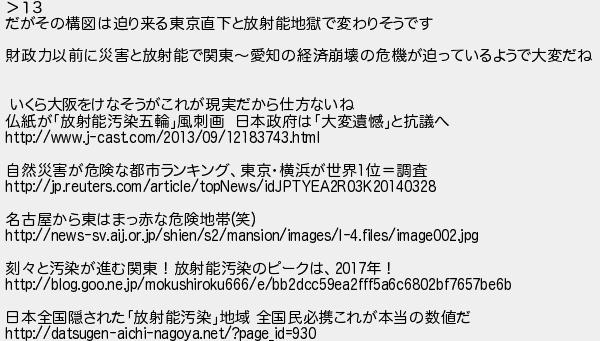 16: [] 2015/04/15(水) 23:20:18.85 ID:Gd+UfJTm >13 だがその構図は迫り来る東京直下と放射能地獄で変わりそうです 財政力以前に災害と放射能で関東〜愛知の経済崩壊の危機が迫っているようで大変だね いくら大阪をけなそうがこれが現実だから仕方ないね 仏紙が「放射能汚染五輪」風刺画 日本政府は「大変遺憾」と抗議へ http://www.j-cast.com/2013/09/12183743.html 自然災害が危険な都市ランキング、東京・横浜が世界1位=調査 http://jp.reuters.com/article/topNews/idJPTYEA2R03K20140328 名古屋から東はまっ赤な危険地帯(笑) http://news-sv.aij.or.jp/shien/s2/mansion/images/I-4.files/image002.jpg 刻々と汚染が進む関東!放射能汚染のピークは、2017年! http://blog.goo.ne.jp/mokushiroku666/e/bb2dcc59ea2fff5a6c6802bf7657be6b 日本全国隠された「放射能汚染」地域 全国民必携これが本当の数値だ http://datsugen-aichi-nagoya.net/?page_id=930 http://egg.5ch.io/test/read.cgi/develop/1427705019/16