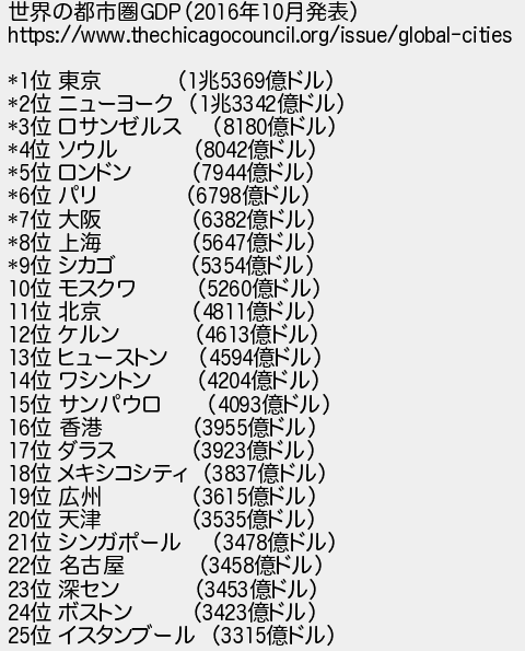 332: [] 2016/11/09(水) 14:33:43.99 ID:IrxYE+Jd 世界の都市圏GDP(2016年10月発表) https://www.thechicagocouncil.org/issue/global-cities *1位 東京 (1兆5369億ドル) *2位 ニューヨーク (1兆3342億ドル) *3位 ロサンゼルス (8180億ドル) *4位 ソウル (8042億ドル) *5位 ロンドン (7944億ドル) *6位 パリ (6798億ドル) *7位 大阪 (6382億ドル) *8位 上海 (5647億ドル) *9位 シカゴ (5354億ドル) 10位 モスクワ (5260億ドル) 11位 北京 (4811億ドル) 12位 ケルン (4613億ドル) 13位 ヒューストン (4594億ドル) 14位 ワシントン (4204億ドル) 15位 サンパウロ (4093億ドル) 16位 香港 (3955億ドル) 17位 ダラス (3923億ドル) 18位 メキシコシティ (3837億ドル) 19位 広州 (3615億ドル) 20位 天津 (3535億ドル) 21位 シンガポール (3478億ドル) 22位 名古屋 (3458億ドル) 23位 深セン (3453億ドル) 24位 ボストン (3423億ドル) 25位 イスタンブール (3315億ドル) http://egg.5ch.io/test/read.cgi/develop/1427705019/332