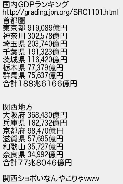 508: (やわらか銀行) [] 2017/04/01(土) 23:09:33.96 ID:D6u6Wh5L 国内GDPランキング http://grading.jpn.org/SRC1101.html 首都圏 東京都 919,089億円 神奈川 302,578億円 埼玉県 203,740億円 千葉県 191,323億円 茨城県 116,420億円 栃木県 77,379億円 群馬県 75,637億円 合計188兆6166億円 関西地方 大阪府 368,430億円 兵庫県 182,732億円 京都府 98,470億円 滋賀県 57,695億円 和歌山 35,727億円 奈良県 34,992億円 合計77兆8046億円 関西ショボいなんやこりゃwww http://egg.5ch.io/test/read.cgi/develop/1427705019/508