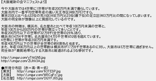 大阪維新の会マニフェストより 今や大阪市では世帯に世帯が年収万円未満で暮らしています 大阪市内で一番平均世帯年収の高い天王寺区万円ですら 東京区と比べると位の荒川区万円と位最下位の足立区万円との間になってしまいます 大阪の街全体が想像以上に貧困化しているのです 大阪市の特徴は横浜市名古屋市と比べて年収万円未満の世帯と 年収万から万円の世帯が際立って多いことです 年収万円以下の世帯が万千全世帯のあり 横浜市万千世帯名古屋市万千世帯の倍を超えています 世帯に世帯が年収万円未満です 年収万円以下の世帯が全世帯の約割を占めます また年収万円以上の世帯数は横浜市が万千世帯あるのに対し大阪市は万世帯に過ぎません 街全体が最貧地帯化する大阪市と報道されるような惨状です 所得分布図 赤高青低 東京 大阪 名古屋