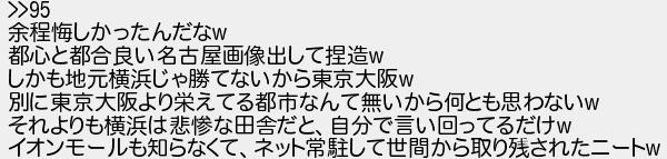 余程悔しかったんだな 都心と都合良い名古屋画像出して造 しかも地元横浜じゃ勝てないから東京大阪 別に東京大阪より栄えてる都市なんて無いから何とも思わない それよりも横浜は悲惨な田舎だと自分で言い回ってるだけ イオンモールも知らなくてネット常駐して世間から取り残されたニート