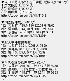 164: [] 2016/06/15(水) 23:24:13.62 ID:Xl+Fxw30 ▼人口10万人あたり在日韓国・朝鮮人ランキング 1位 大阪府 1,530.54人 2位 京都府 1,290.85人 3位 兵庫県 0,978.73人 http://todo-ran.com/t/kiji/11618 ▼刑法犯件数ランキング 1位 大阪府 199,441件 226.61件 79.05 2位 愛知県 144,001件 194.12件 70.30 3位 京都府 48,989件 186.84件 68.34 http://todo-ran.com/t/kiji/13944 ▼殺人事件被害者数 1位 大阪府 69.7人 0.791人 74.70 2位 沖縄県 10.5人 0.771人 73.00 3位 香川県 7.5人 0.741人 70.32 http://todo-ran.com/t/kiji/10567 ▼生活保護受給世帯ランキング 1位 大阪府 215,289世帯 5.47世帯 80.38 2位 高知県 15,279世帯 4.36世帯 69.47 3位 北海道 115,877世帯 4.34世帯 69.23 http://todo-ran.com/t/kiji/11767 ‥ http://egg.5ch.io/test/read.cgi/develop/1464996989/164