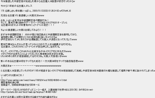 今は衰退した中部空港が完成した頃から名古屋人は妄想が好きだったから 今から年前の名古屋人のレス 名無しさんお腹いっぱい 日 元気な名古屋 衰退著しい大阪対決 さあいよいよ来月は中部国際空港の開港だね! そして愛知万博と期待のテーマパークであるイタリア村のオープンと 名古屋は点セットの未曾有のビッグイベント続き!!! ちょっと衰退著しい大阪と比較してみよう!!! まずは中部国際空港! が既に物流拠点に中部国際空港を表明しており 貨物便に関しては関空どころか成田も軽く抜いちゃうかも 伊丹空港なんてあたりが全便撤退して大阪人が涙目になってたりして 愛知万博はなんだかんだ言って少なくとも5千万人位は動員するだろうな 名古屋はこれだけのビッグイベントが目白押しだ当然だろ そしてイタリア村これはと比較するのはイタリア村に失礼だろ イタリア村が出来たことによっての入場者数は尻すぼみ状態 は年と待たず経営破綻してるだろうね大阪人可哀相っす 勢いのある名古屋は何をやっても大成功!一方大阪は何をやっても駄目駄目君 大阪ざまぁーーーーーーーーーーー と名古屋人は妄想していたのだが年が経過するとイタリア村は経営破綻して消滅し中部空港は欧米路線の大幅な撤退して福岡や新千歳に抜かれてしまった いっぽうの大阪はこれ! 関空爆発的伸び率 営業益で羽田成田を抜き去り日本一に テーマパークが初のディズニーシー超え 入園者数で世界4位に さすが名古屋人は誇大妄想をする癖が今も昔も健在だな