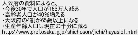 大阪府の資料によると 今後年で人口が万人減る 高齢者人口が増える 大阪府の割が歳以上になる 生産年齢人口は現在の半分に減る