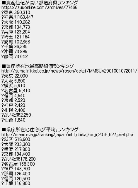 5: [] 2016/06/04(土) 10:00:01.91 ID:PgsURtlZ ■資産価値が高い都道府県ランキング https://zuuonline.com/archives/77466 ?東京 350,310 ?神奈川183,447 ?大阪 140,282 ?京都 134,773 ?兵庫 123,204 ?埼玉 121,164 ?愛知 102,868 ?千葉 96,385 ?沖縄 73,996 ?静岡 73,642 ■県庁所在地最高路線価ランキング http://sumai.nikkei.co.jp/news/rosen/detail/MMSUv2001001072011/ ?東京 22,000 ?大阪 6,800 ?横浜 5,910 ?名古屋 5,810 ?福岡 4,640 ?京都 2,520 ?神戸 2,420 ?札幌 2,400 ?さいたま2,250 ?仙台 1,840 ■県庁所在地住宅地「平均」ランキング http://memorva.jp/ranking/japan/mlit_chika_kouji_2015_h27_pref.php ?23区 518,600 ?大阪 233,300 ?横浜 217,800 ?京都 194,400 ?さいたま178,200 ?名古屋 168,300 ?神戸 143,700 ?那覇 126,400 ?福岡 120,500 ?千葉 116,800 http://egg.5ch.io/test/read.cgi/develop/1464996989/5
