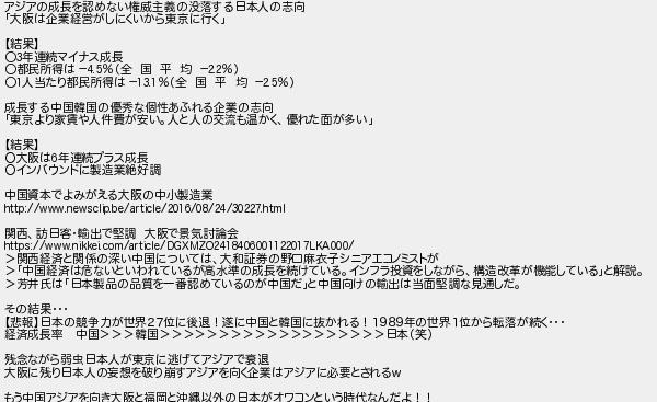 アジアの成長を認めない権威主義の没落する日本人の志向 大阪は企業経営がしにくいから東京に行く 結果 年連続マイナス成長 都民所得は 全 国 平 均 人当たり都民所得は 全 国 平 均 成長する中国韓国の優秀な個性あふれる企業の志向 東京より家賃や人件費が安い人と人の交流も温かく優れた面が多い 結果 大阪は年連続プラス成長 インバウンドに製造業絶好調 中国資本でよみがえる大阪の中小製造業 関西訪日客輸出で堅調 大阪で景気討論会 関西経済と関係の深い中国については大和証券の野口麻衣子シニアエコノミストが 中国経済は危ないといわれているが高水準の成長を続けているインフラ投資をしながら構造改革が機能していると解説 芳井氏は日本製品の品質を一番認めているのが中国だと中国向けの輸出は当面堅調な見通しだ その結果 悲報日本の競争力が世界27位に後退!遂に中国と韓国に抜かれる!1989年の世界1位から転落が続く 経済成長率 中国韓国日本笑 残念ながら弱虫日本人が東京に逃げてアジアで衰退 大阪に残り日本人の妄想を破り崩すアジアを向く企業はアジアに必要とされる もう中国アジアを向き大阪と福岡と沖縄以外の日本がオワコンという時代なんだよ!!