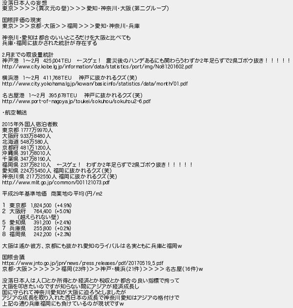 665: (空) [] 2017/12/18(月) 06:27:39.22 ID:TnBu0WNJ 没落日本人の妄想 東京>>>>(異次元の壁)>>>愛知・神奈川・大阪(第二グループ) 国際評価の現実 東京>>>京都・大阪>>福岡>>>愛知・神奈川・兵庫 神奈川・愛知は都合のいいところだけを大阪と比べても 兵庫・福岡に抜かされた統計が存在する 2月までの取扱量統計 神戸港 1〜2月 425,004TEU ←スゲェ! 震災後のハンデあるにも関わらうわずか2年足らずで2県ゴボウ抜き!!!!! http://www.city.kobe.lg.jp/information/data/statistics/port/img/No81201602.pdf 横浜港 1〜2月 411,768TEU 神戸に抜かれるクズ(笑) http://www.city.yokohama.lg.jp/kowan/basicinfo/statistics/data/month/01.pdf 名古屋港 1〜2月 395,678TEU 神戸に抜かれるクズ(笑) http://www.port-of-nagoya.jp/toukei/sokuhou/sokuhou2-6.pdf ・航空輸送 2015年外国人宿泊者数 東京都 1777万9970人 大阪府 933万8480人 北海道 548万580人 京都府 481万1200人 沖縄県 391万8010人 千葉県 347万8190人 福岡県 237万8210人 ←スゲェ! わずか2年足らずで2県ゴボウ抜き!!!!! 愛知県 224万5450人 福岡に抜かれるクズ(笑) 神奈川県 217万2550人 福岡に抜かれるクズ(笑) http://www.mlit.go.jp/common/001121073.pdf 平成29年基準地価 商業地の平均(円/m2 1 東京都 1,824,500 (+4.9%) 2 大阪府 764,400 (+5.0%) (越えられない壁) 5 愛知県 391,200 (+2.4%) 7 兵庫県 255,800 (+0.2%) 8 福岡県 242,200 (+2.3%) 大阪は遙か彼方、京都にも抜かれ愛知のライバルは名実ともに兵庫と福岡w 国際会議 https://www.jnto.go.jp/jpn/news/press_releases/pdf/20170519_5.pdf 京都・大阪>>>>>>福岡(23件)>>神戸・横浜(21件)>>>>名古屋(16件)w 没落日本人は人口とか所得とか経済とか税収とか都合の良い指標で拘って 大阪を叩きたいのですが知らない間にアジアが経済成長し 国に守られて神奈川愛知が大阪に迫ろうとしましたが アジアの成長を取り入れた西日本の成長で神奈川愛知はアジアの格付けで 上記の通り兵庫福岡にも負けているのが現状ですw http://egg.5ch.io/test/read.cgi/develop/1464996989/665